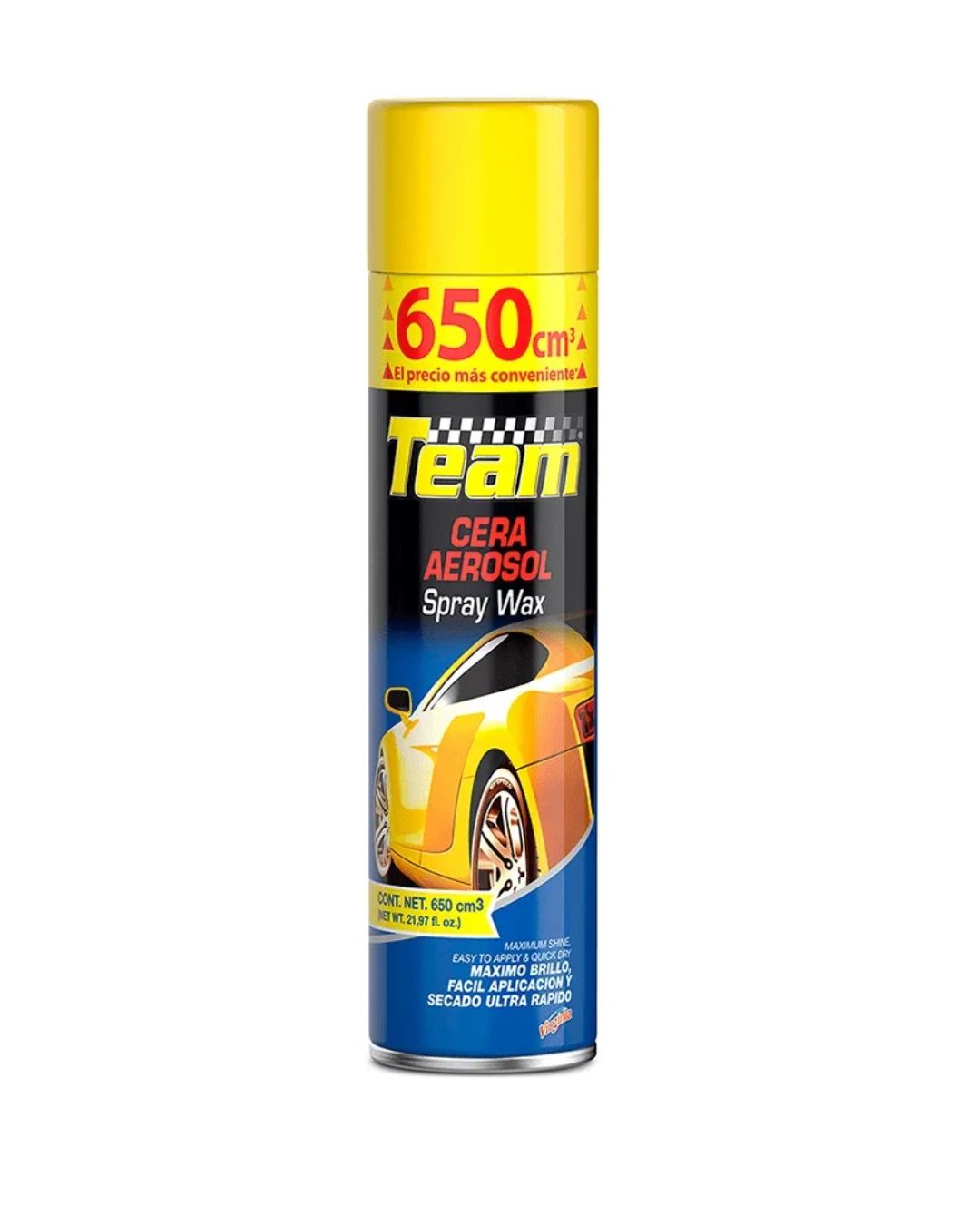 Cera aerosol Team es un producto de muy fácil aplicación, no contiene abrasivos que dañen la pintura de su automóvil y proporciona una delgada capa protectora. Brillo al instante y sin esfuerzo.