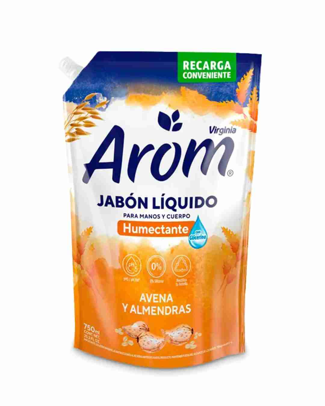 El Jabón Líquido Arom Avena y Almendras (750 ml) en formato Doypack es una solución de limpieza para manos y cuerpo que nutre e hidrata profundamente