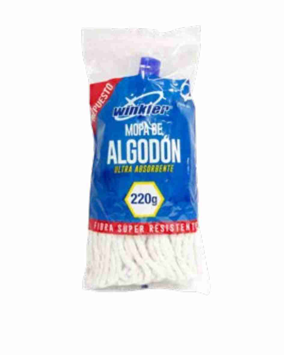 Es ideal para uso doméstico o comercial ligero con balde estrujador, compatible con mangos estándar de rosca, fabricada en algodón blanco resistente.
