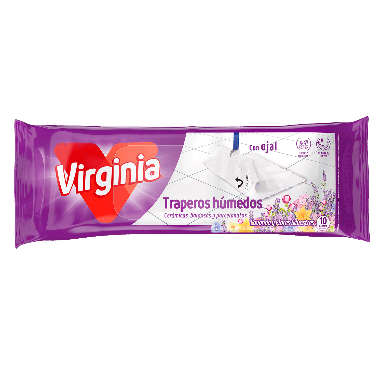 Los Traperos húmedos Multiuso Virginia limpian su hogar de forma rápida y efectiva. Recogen la suciedad y el polvo limpiando el piso y dejando un agradable aroma a Lavanda y Flores Silvestres.